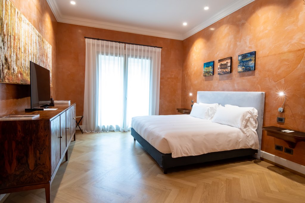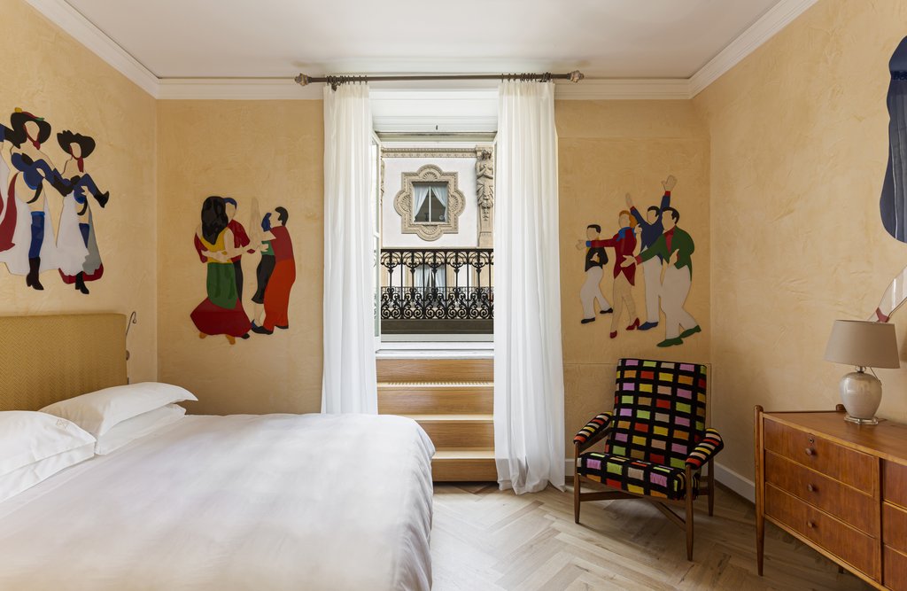 伦多(Rendo)豪华画廊客房,其生动的原色块构成了床的框架。阿德里亚诺蓬帕(Adriano Pompa)画廊套房,在文艺复兴风格的壁画下有一间夹层卧室。两个餐厅构成了这张画作:维基西莫(Vikissimo)忙于黎明到黄昏的食物和饮料,而多迪西·加蒂(I Dodici Gatti)则是专门制作木柴烤比萨饼的。
