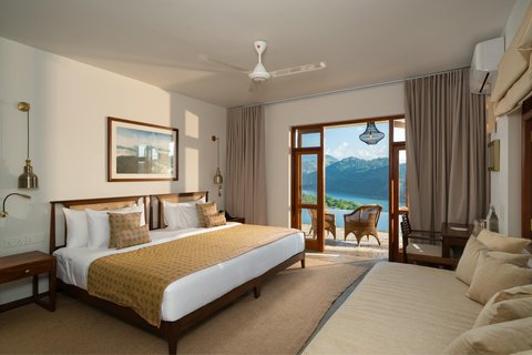 别墅的每间客房均采用简洁雅致的设计风格。挺括的亚麻床品、超大尺寸睡床与双台盆洗漱区,每一处细节都经过精心考量。入住高级房,你可在私人露台俯瞰粼粼水光,将葱郁山峦尽收眼底;若选择豪华房,则能拥有奢华四柱床与专属按摩浴缸 —— 你尽可一边饱览窗外景致,一边暗自赞叹自己挑选酒店的绝佳眼光。餐饮服务在通透舒适的户外餐厅提供,技艺精湛的主厨会烹制地道本地菜肴,还可根据你的口味需求灵活调整。