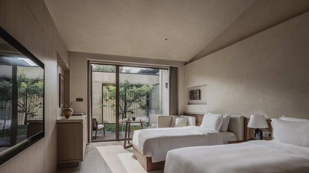 客房环抱着中央庭院,庭院中静思池水映天光,简约绿意点缀其间。阳光洒满的房间,视野宁静,装潢温馨而富有包裹感。您可在独立浴缸中沉浸舒缓,帕尔玛之水(Aqua di Parma)的芬芳洗去一身疲惫;或移步酒吧,技艺精湛的调酒师将十三朝古都的传奇,悄然调入杯中的招牌鸡尾酒。