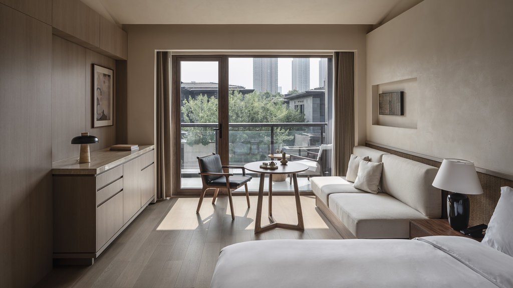 酒店内风格极简静谧,门外的西安却拥有千年古刹古寺与巍峨的城墙、繁华的购物中心与目不暇接的当地美食。城外,兵马俑博物馆深藏着世界最宏伟的考古奇迹之一。近处,信步城墙之上,是揽尽古城天际线、触摸西安璀璨历史的绝佳方式。
